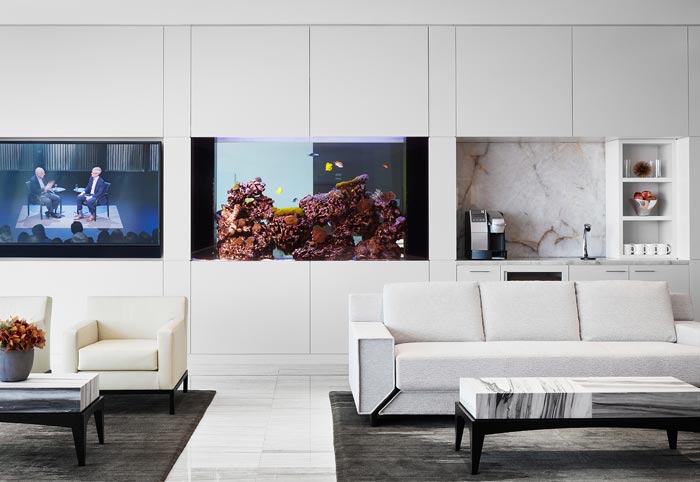 前臺的設計:設計師在設計的時候,采用角度的錯覺來設計空間,設計師要的就是在同一個空間之內(nèi)可以完成不同的設計,設計師首先就是經(jīng)過斜角的設計,既展現(xiàn)了前臺的功能性,同時也為接待區(qū)域預留了足夠的空間,斜角動線讓一個空間使用達到最大化。